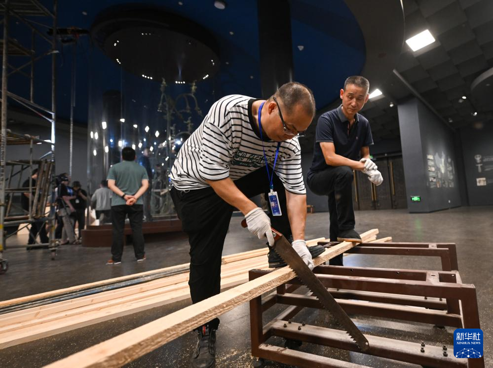 在三星堆博物馆老馆,工作人员在切割木条,目的是固定文物,避免在运输过程中因颠簸产生损坏(7月16日摄)。