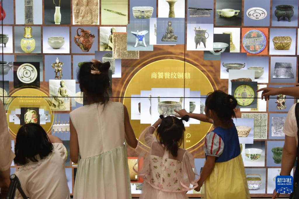 8月9日,小朋友在河南省开封市博物馆里体验文物电子展示交互大屏。