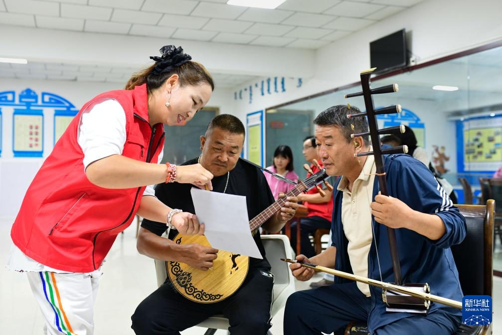 8月26日,在鄂托克前旗上海庙镇阿勒台嘎查文化活动中心美育课堂上,志愿者乌吉斯古楞(左)指导农牧民练习乐器演奏。