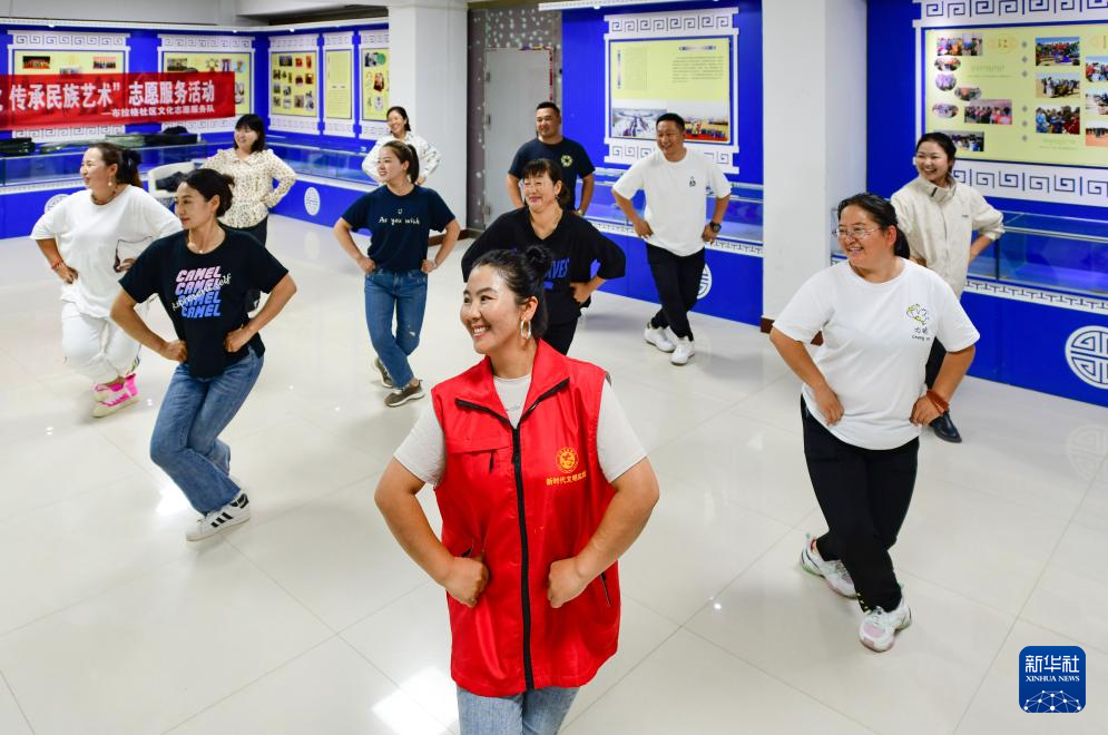 8月26日,在鄂托克前旗上海庙镇阿勒台嘎查文化活动中心美育课堂上,志愿者奇明(前)带领农牧民练习舞蹈。