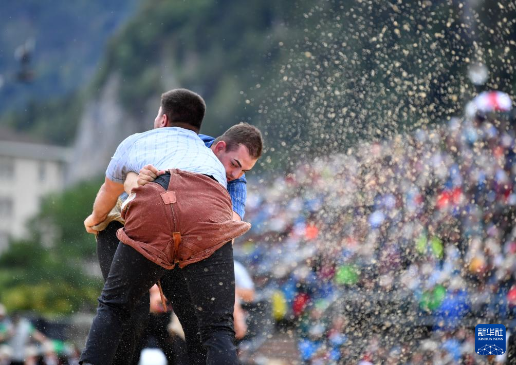 8月27日,在瑞士因特拉肯,人们在阿尔卑斯山牧羊人节上参加传统摔跤比赛。