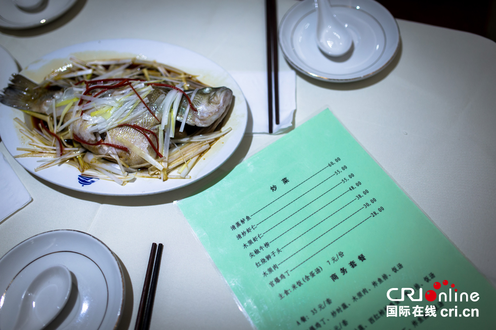 除了點(diǎn)套餐的旅客,還有很多單點(diǎn)菜品。清蒸鱸魚(yú)是白師傅的招牌菜之一,因?yàn)檫@道菜也有很多回頭客。圖為白振慶師傅將準(zhǔn)備好的鱸魚(yú)放到蒸箱中。