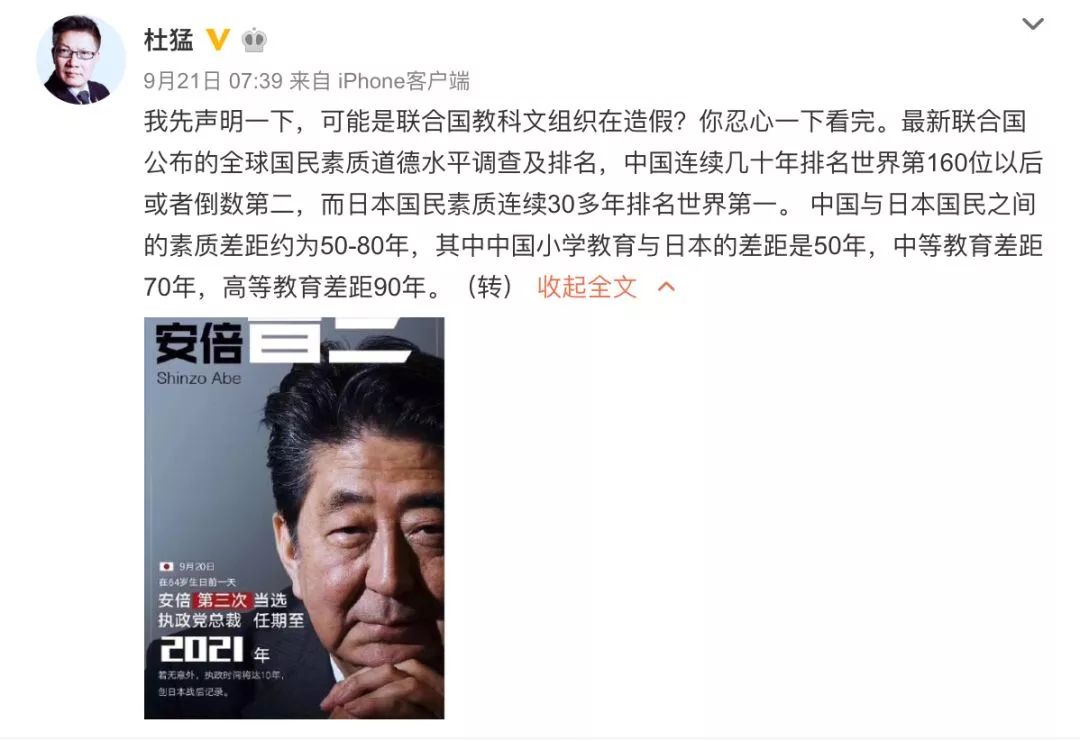 2018年9月21日,擁有近220萬粉絲的大V“杜猛”一大清早就發(fā)布了一條微博:“最新聯(lián)合國公布的全球國民素質(zhì)道德水平調(diào)查及排名,中國連續(xù)幾十年排名世界第160位以后或者倒數(shù)第二,而日本國民素質(zhì)連續(xù)30多年排名世界第一。中國與日本國民之間的素質(zhì)差距約為50-80年,其中中國小學(xué)教育與日本的差距是50年,中等教育差距70年,高等教育差距90年?!彼m然在微博的最后加了個括號寫了個“轉(zhuǎn)”字,但并未寫明來源。配圖內(nèi)容是:前一天,安倍晉三第三次當(dāng)選日本執(zhí)政黨總裁。