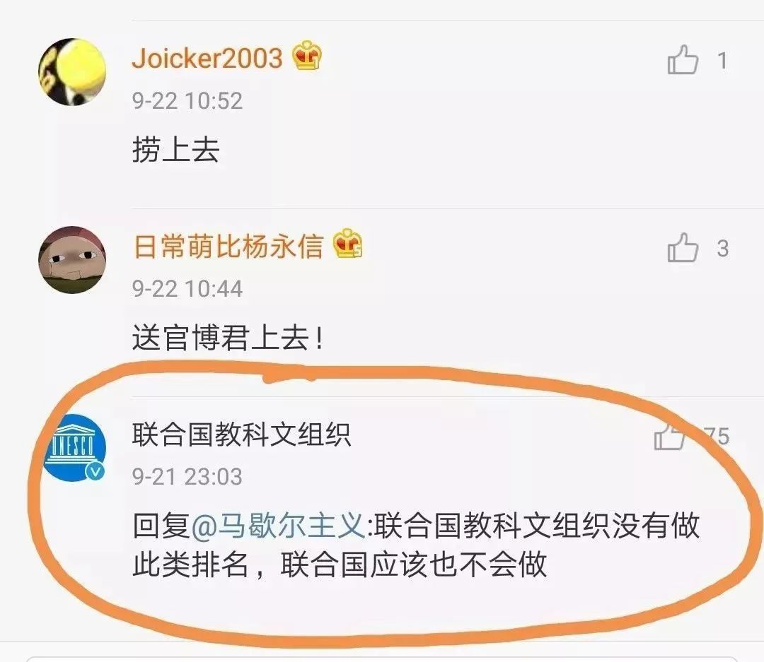 諷刺的是,“杜猛”還在微博最開始加了句“我先聲明一下,可能是聯(lián)合國教科文組織在造假?你忍心一下看完?!苯Y(jié)果聯(lián)合國教科文組織的官方微博當(dāng)天就出來“強力打臉”,聲明“聯(lián)合國教科文組織沒有做此類排名,聯(lián)合國應(yīng)該也不會做?!边@條微博被多名網(wǎng)友舉報,微博管理方最后對其做了“不實”的標(biāo)記,對博主禁言15天,但這條假消息并未被刪,仍然掛在那里,甚是刺眼。而作者在被處理前還接著轉(zhuǎn)發(fā)了好幾條貶低中國的評論。