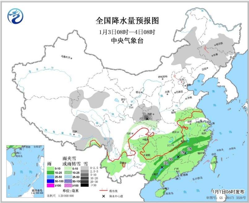 受低層切變系統(tǒng)影響,未來(lái)三天江南華南多陰雨雪天氣,其中,1月1~2日江南、華南等地有小雨雪,貴州中部、湖南中南部、江西西部和北部等地有小雪或雨夾雪,局地有凍雨,云南中南部、華南等地部分地區(qū)有小到中雨,1月3日起,我國(guó)中東部地區(qū)自西向東將有一次較明顯降水過(guò)程。
