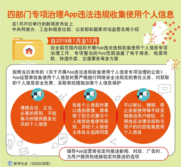 新華社北京1月25日電(記者王鵬)在25日舉行的新聞發(fā)布會(huì)上,中央網(wǎng)信辦、工業(yè)和信息化部、公安部和國(guó)家市場(chǎng)監(jiān)管總局介紹,自2019年1月至12月,在全國(guó)范圍內(nèi)組織開展App違法違規(guī)收集使用個(gè)人信息專項(xiàng)治理工作,專項(xiàng)整治的App范圍涵蓋了電子商務(wù)、地圖導(dǎo)航、快遞外賣、交通票務(wù)等多方面。