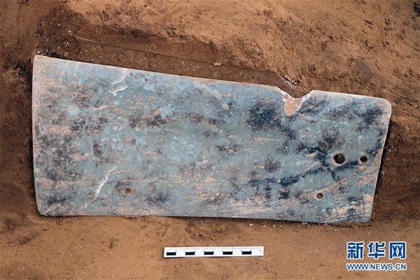 這是陜西延安蘆山峁新石器時(shí)代遺址營(yíng)盤梁院落北門外祭祀坑出土大玉刀(資料照片)。新華社發(fā)