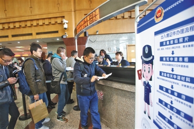 昨日,北京市公安局出入境接待大廳,居民排隊領(lǐng)號辦理出入境證件。記者 王貴彬 攝