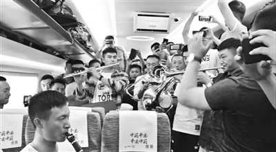 聯(lián)合軍樂團在回撤高鐵上演奏并歌唱《鋼鐵洪流進行曲》