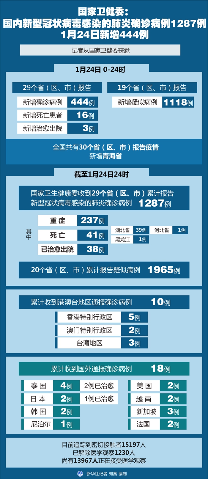 截至1月24日24時,國家衛(wèi)健委收到29個?。▍^(qū)、市)累計報告新型冠狀病毒感染的肺炎確診病例1287例,其中重癥237例,死亡41例(湖北省39例、河北省1例、黑龍江1例)。已治愈出院38例。20個?。▍^(qū)、市)累計報告疑似病例1965例。