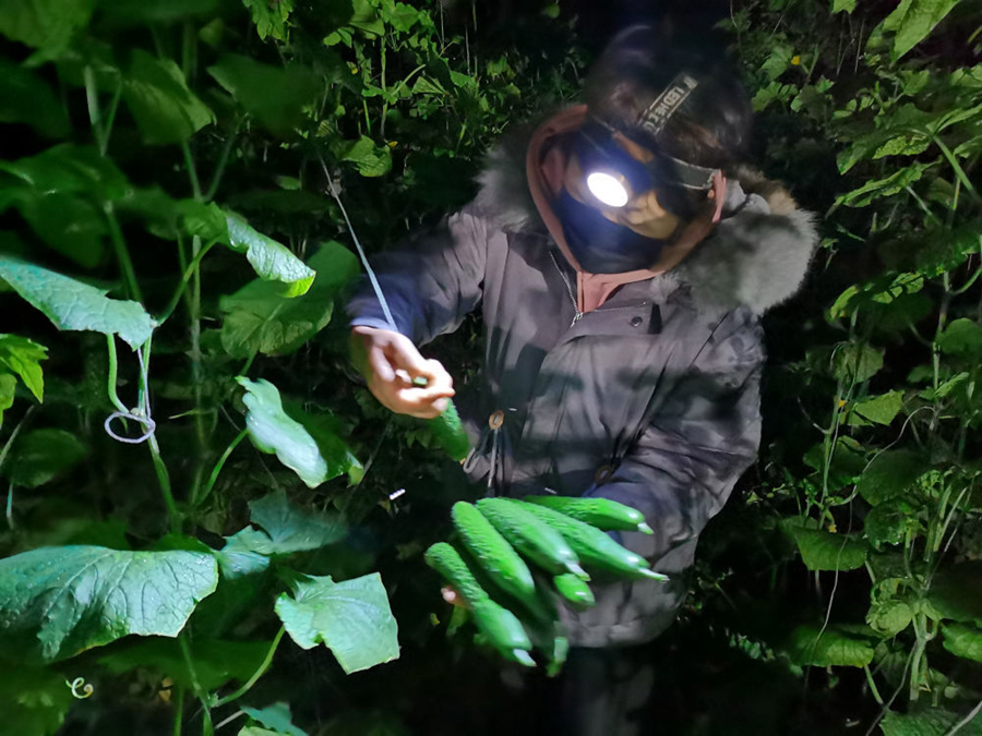 1月28日,山東省壽光市的蔬菜種植戶凌晨1點(diǎn)多在大棚里采摘蔬菜。新華社發(fā)