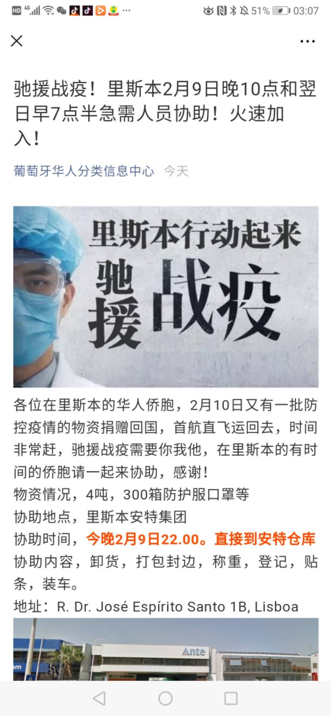 葡萄牙里斯本僑胞劉建云在獲悉省僑聯(lián)西班牙第二批物資因航班臨時(shí)取消必須分流至葡萄牙里斯本卻面臨物流運(yùn)送困難的信息時(shí),二話不說,立刻在微信群里吹響集結(jié)的號(hào)角:“由西班牙華人僑胞募捐籌集的20噸防護(hù)服、護(hù)目鏡和口罩等醫(yī)療物資,緊急轉(zhuǎn)運(yùn)葡萄牙交付首都航空中葡直航航班托運(yùn)回國,當(dāng)晚22:30分急需人手卸貨、打包、裝車。有空的僑胞請(qǐng)接龍報(bào)名!”群里一呼百應(yīng),瞬時(shí)超員。當(dāng)晚就將西班牙運(yùn)送過來的捐贈(zèng)物資進(jìn)行重新打包直至深夜。