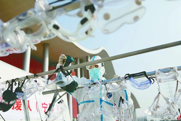 2月22日,武漢市武漢客廳方艙醫(yī)院外,援鄂醫(yī)療隊工作人員清潔護(hù)目鏡。 中國攝協(xié)赴湖北抗擊疫情攝影小分隊?李舸 攝