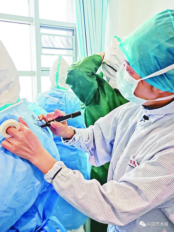 2月22日,武漢華中科技大學(xué)同濟(jì)醫(yī)學(xué)院附屬同濟(jì)醫(yī)院中法新城院區(qū),北京醫(yī)院國家醫(yī)療隊負(fù)責(zé)的病區(qū)。醫(yī)護(hù)人員在防護(hù)服上寫下姓名,整裝待發(fā)。中國攝協(xié)赴湖北抗擊疫情攝影小分隊 陳黎明 攝