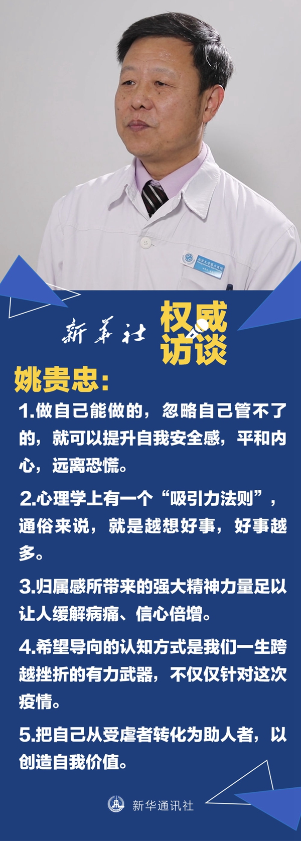 姚貴忠:知足感可以給你精神上的力量。在這次疫情中,我們可以做一些比較,比如:悶在家里不能出門(mén),總比被困郵輪上的游客好吧?家人患病被隔離,總比病情危重甚至失去生命好吧?