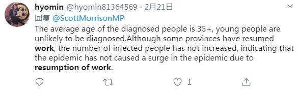 推特用戶hyomin說,一些省份已經復工,不過受感染的人數(shù)沒有隨之增加,這表明復工復產沒有導致更多感染病例。