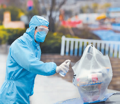 重慶部分火鍋企業(yè)在重慶市商務(wù)委和相關(guān)部門的指導(dǎo)下,為消費者提供零接觸火鍋外賣服務(wù)。圖為重慶一家火鍋店的配送人員在消費者來取外賣之前對包裝袋進行消毒。新華社記者 王全超攝