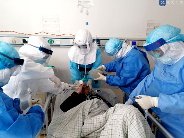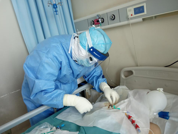 但病毒不會等你嚴(yán)陣以待再發(fā)動進(jìn)攻。病房完成改造的第二天,就有兩名患者出現(xiàn)緊急狀況,需要搶救性氣管插管。這是一場硬仗。操作過程中,患者氣道開放,醫(yī)生距離患者不到20厘米,被感染的風(fēng)險(xiǎn)非常大。整個過程必須在幾分鐘內(nèi)完成,稍有猶豫,患者就可能面臨生命危險(xiǎn)。
