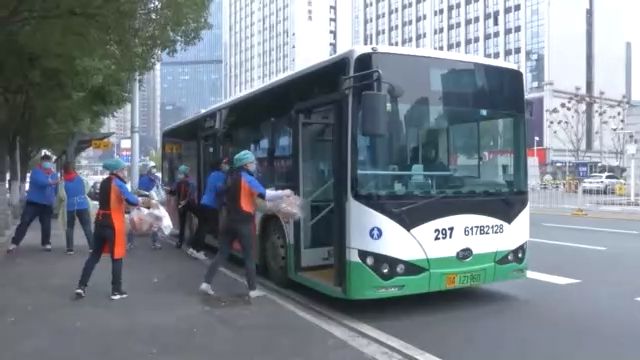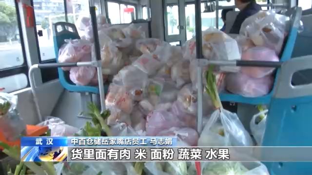 十點(diǎn)整,運(yùn)送1500包愛心菜和500多包其它生活物資的專車來了:一輛297路公交車。為了提高運(yùn)輸效率,武漢市公交集團(tuán)承接了全市社區(qū)團(tuán)購(gòu)的集中配送任務(wù)。幾十名超市員工組成“人力傳送帶”把物資送上車。很快,公交車出發(fā)了。
