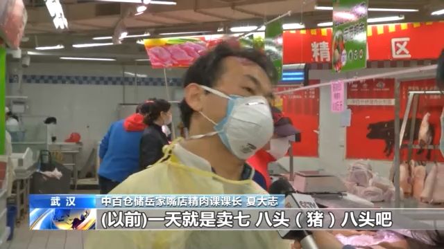 中百倉儲(chǔ)岳家嘴店精肉課課長(zhǎng) 夏大志:以前賣8頭豬16片,現(xiàn)在賣15頭 30片,冷凍肉一天要賣一兩噸,箱子裝的100多箱。