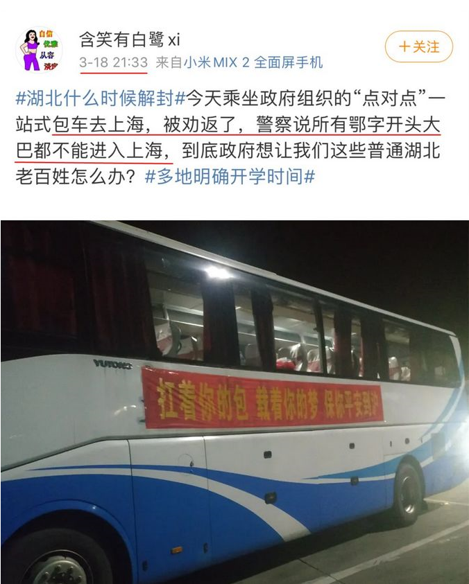 有媒體報道稱,3月18日至3月19日,多個湖北縣市的點對點大巴包車,到達上海市附近高速收費站或高速公路后,遭遇無法進入上海的囧境。不少返程復(fù)工人員為此等待至深夜,甚至只能在大巴車中過夜。