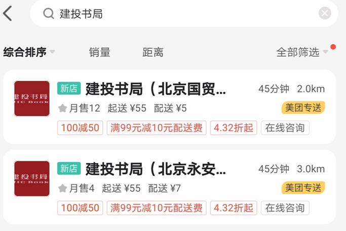 在外賣平臺上搜索可以發(fā)現(xiàn),不同書店標注的起送價格不同,同時也會顯示店面與用戶的距離,以及需要的配送時間等信息。