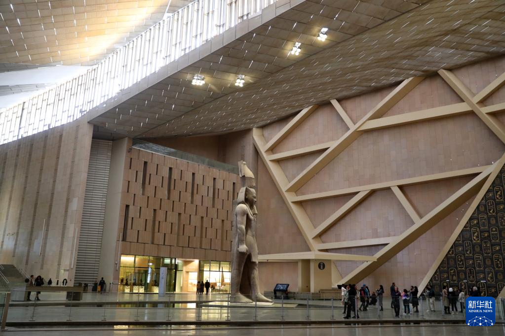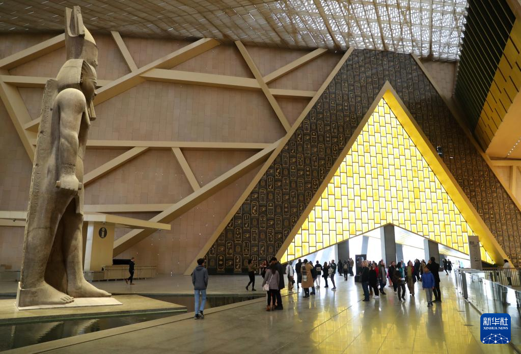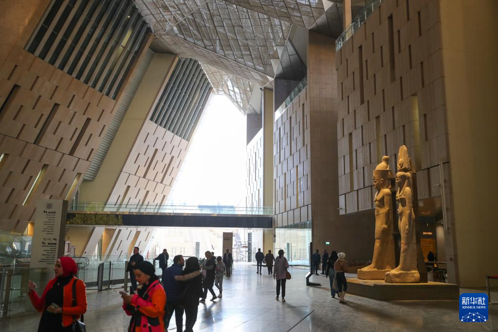2月11日,游客在位于埃及吉萨省的大埃及博物馆大厅已开放区域参观。