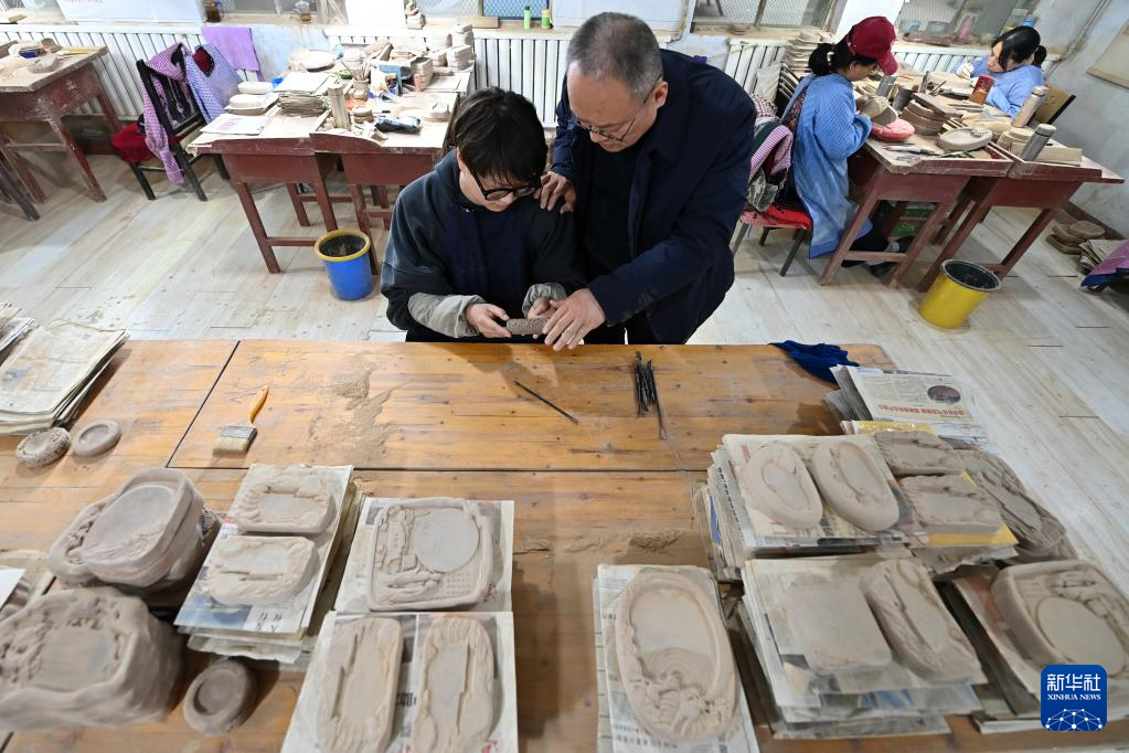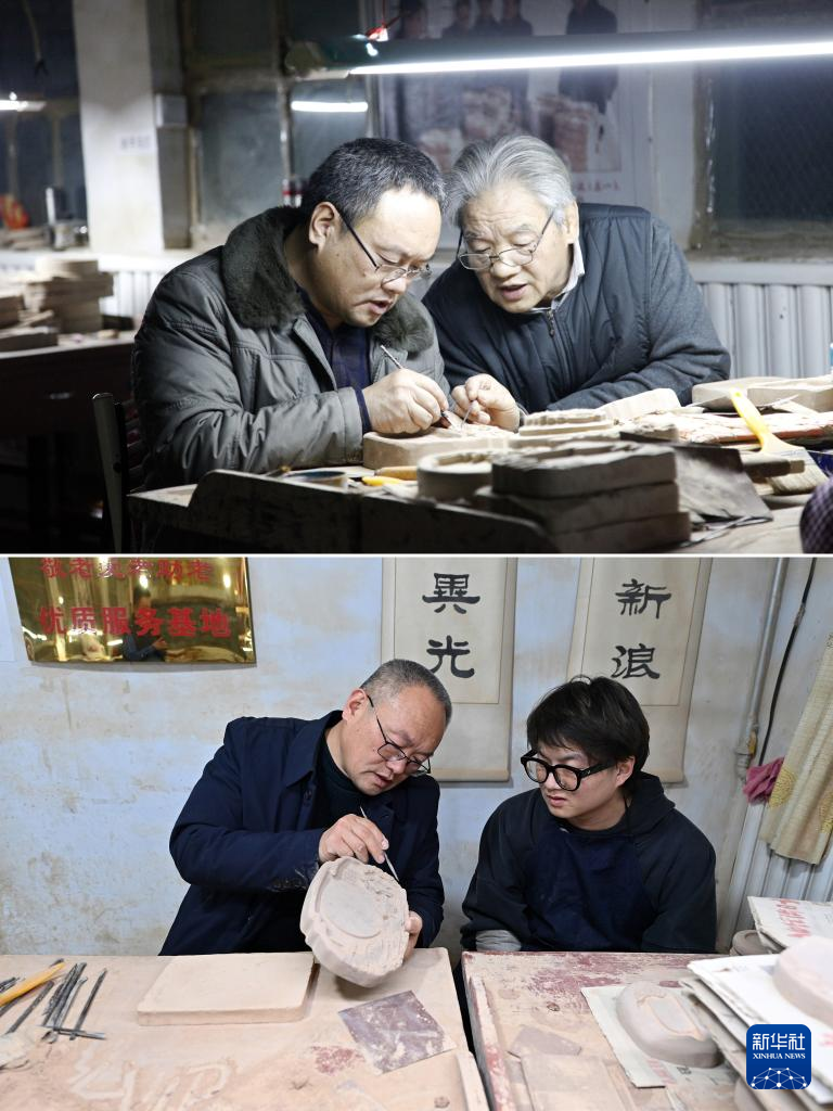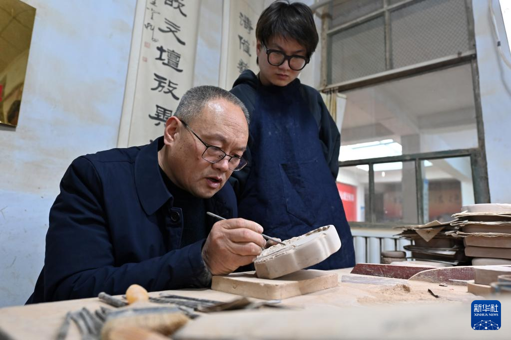 2月14日,在位于新绛县光村的绛州澄泥砚生产基地,绛州澄泥砚制作技艺省级代表性传承人蔺涛(左)指导儿子蔺霄鳞处理澄泥砚雕刻的细节。
