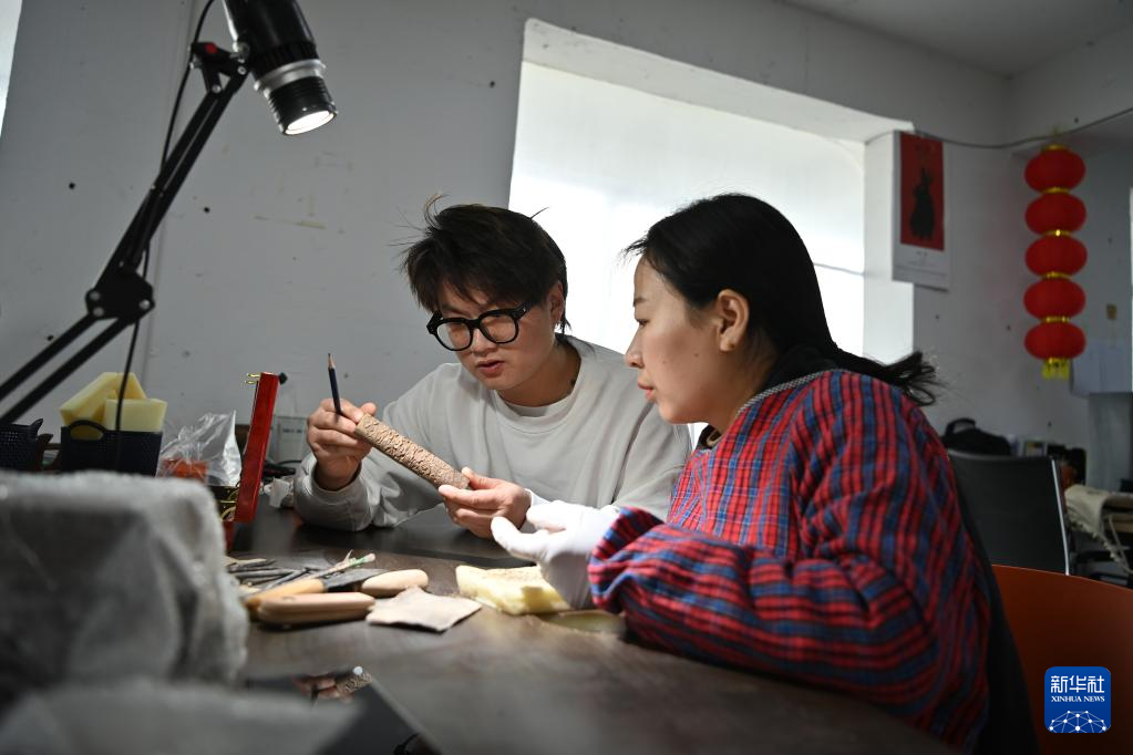 2月15日,在位于新绛县绛州澄泥砚文化园的工作室内,蔺霄鳞(左)和同事交流心得。