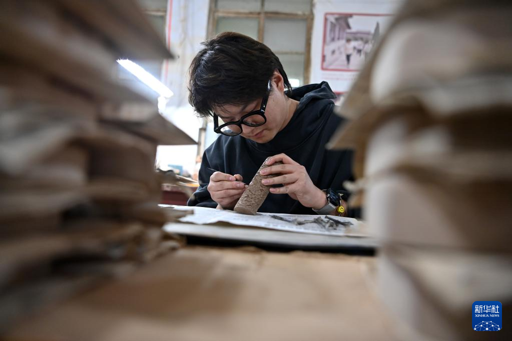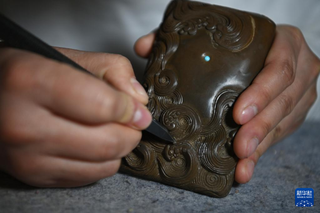 2月14日,在位于新绛县光村的绛州澄泥砚生产基地,蔺霄鳞在雕刻澄泥砚。