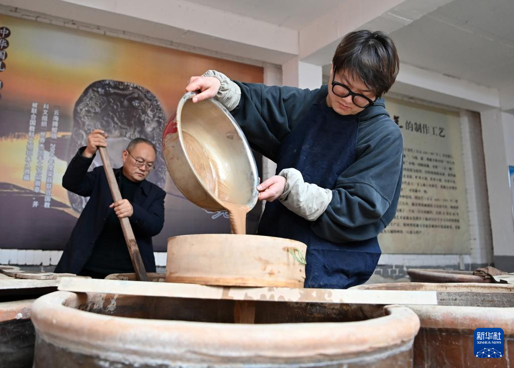 2月14日,在位于新绛县光村的绛州澄泥砚生产基地,蔺霄鳞(右)在澄清过滤。