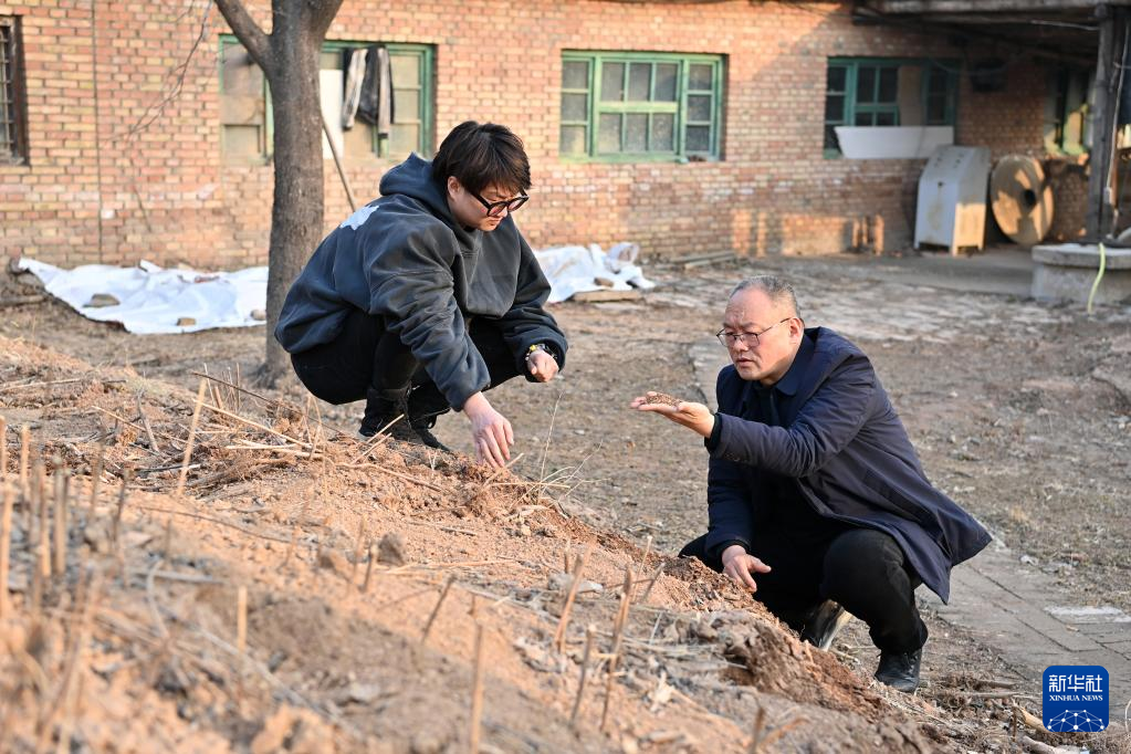 2月14日,在位于新绛县光村的绛州澄泥砚生产基地,蔺霄鳞和父亲蔺涛(右)交流澄泥砚选泥心得。