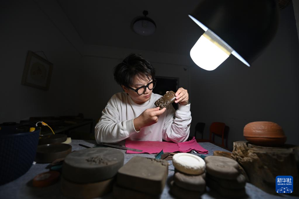 2月15日,在位于新绛县绛州澄泥砚文化园的工作室内,蔺霄鳞对澄泥砚进行完善。