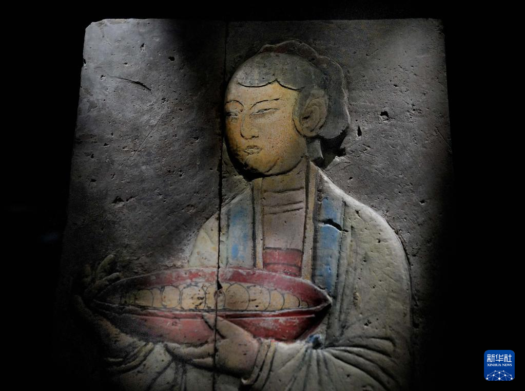 这是在郑州大象陶瓷博物馆举行的“宋人生活与二十四孝砖雕展”上展出的彩绘侍女俑砖雕局部(3月1日摄)。