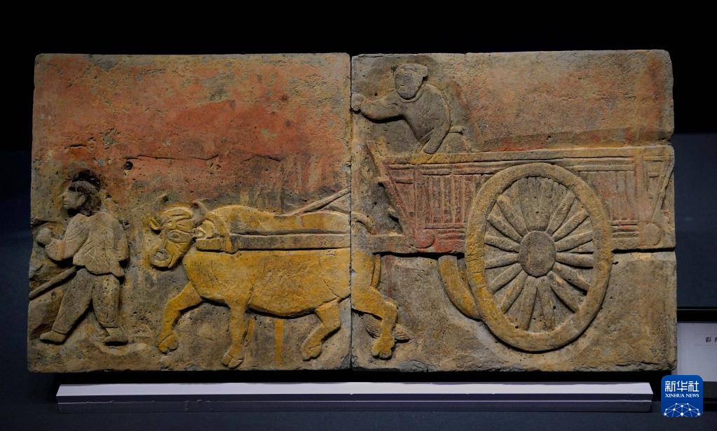 这是在郑州大象陶瓷博物馆举行的“宋人生活与二十四孝砖雕展”上展出的彩绘牛拉车砖雕(3月1日摄)。