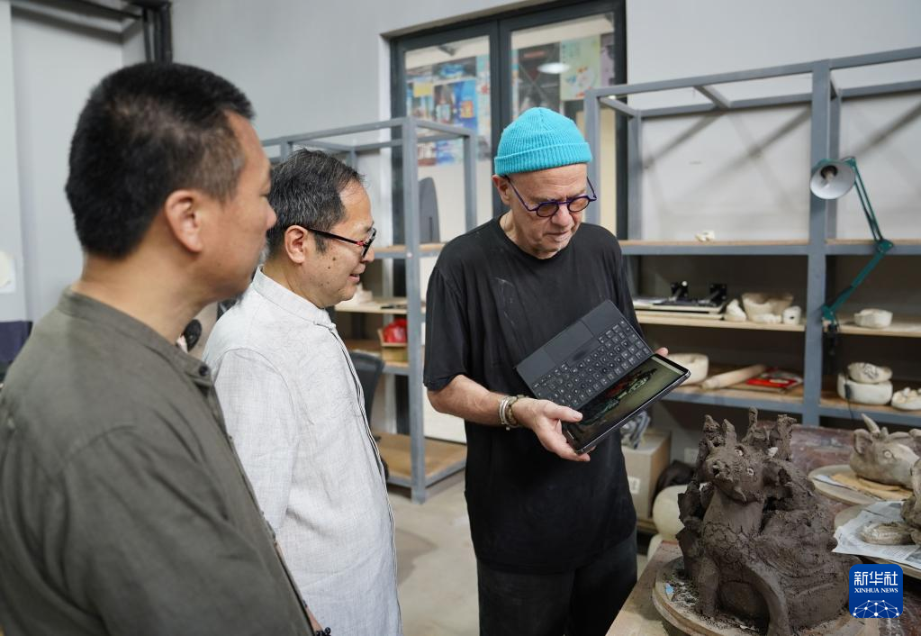托尔斯滕·尤雷尔在江西景德镇陶溪川陶瓷文化创意园自己的工作室内与朋友们交流(4月20日摄)。