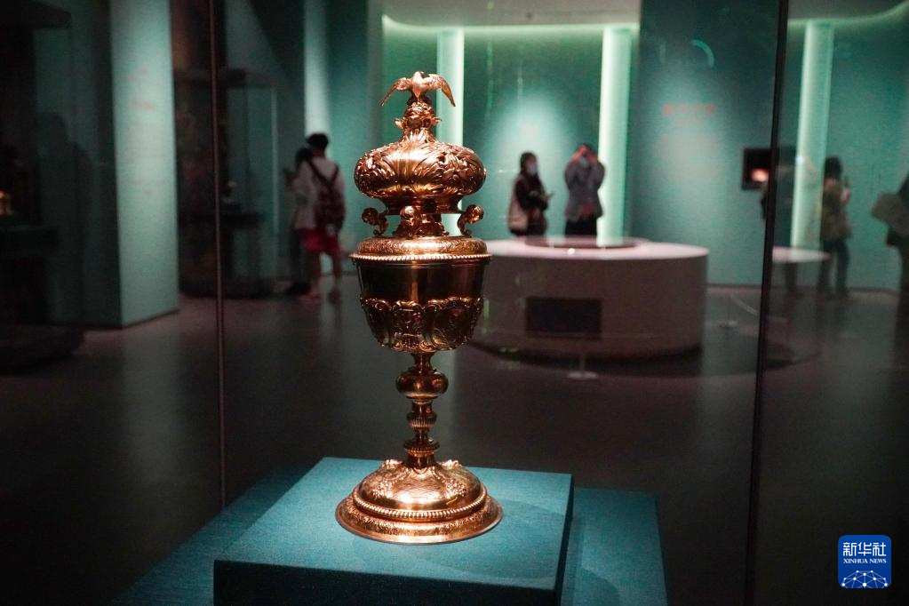 4月29日,在位于山东省济南市的山东博物馆,参观者在英国V&A博物馆藏吉尔伯特精品展上观看展品《嵌银浮雕冷酒器》。