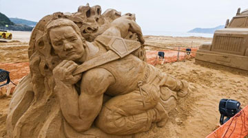 这是4月27日在广东省博物馆的“绽放:维多利亚时代的艺术”预展上拍摄的《与蟒搏斗的勇士》。
