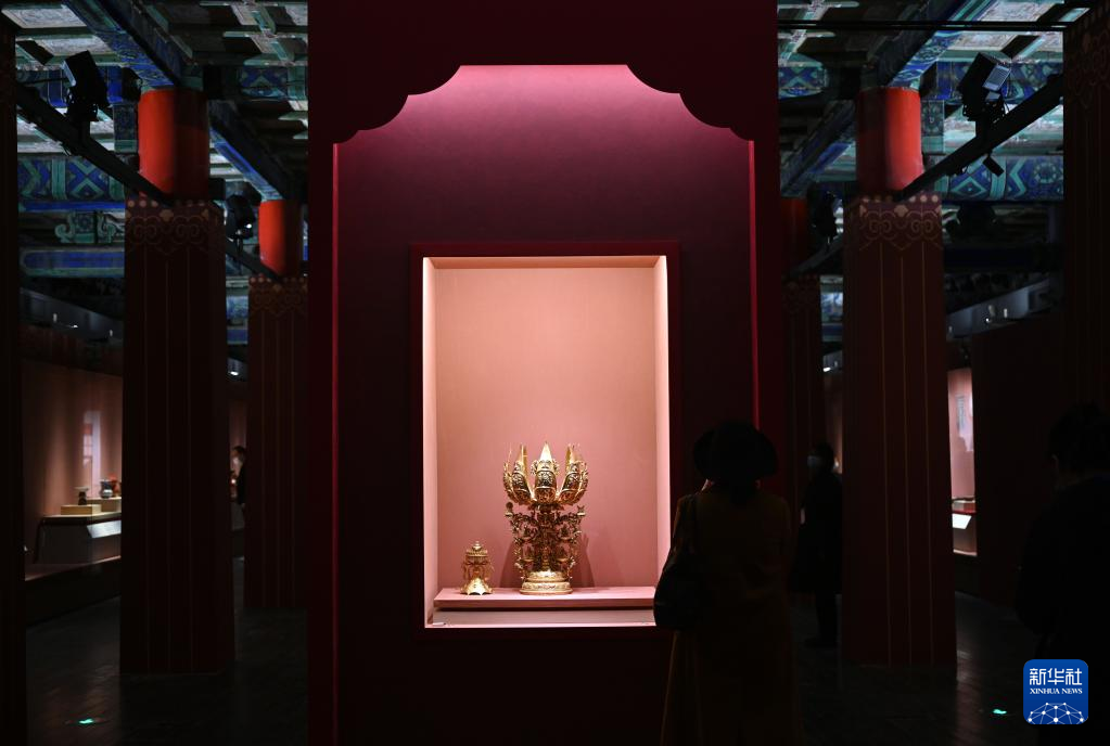 4月28日,嘉宾在北京故宫博物院参观梵华楼铜鎏金般若品佛像。
