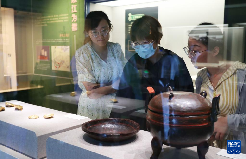 7月10日,参观者在一组漆器展品前驻足观看。