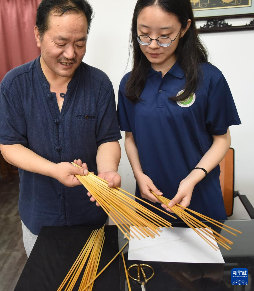 7月12日,吴永龙向学生展示麦秆画的拼接方法。