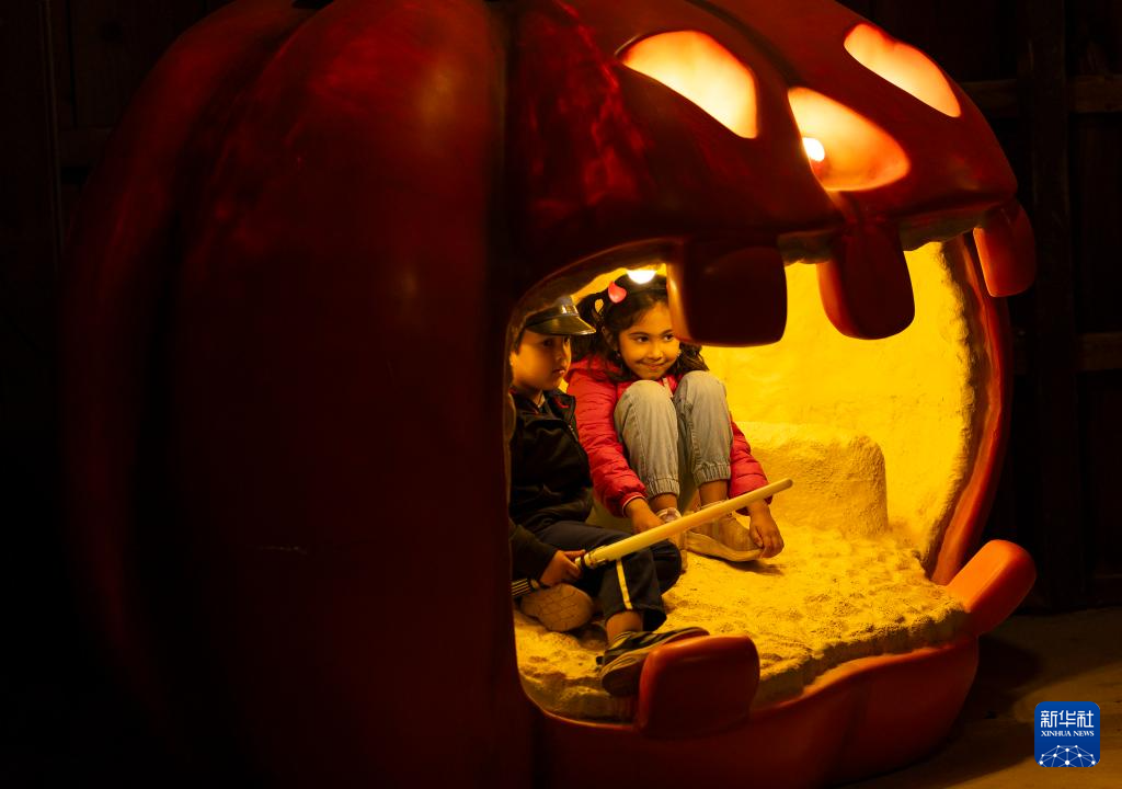 9月23日,在加拿大安大略省米尔顿举办的南瓜灯展上,两名儿童在一个南瓜灯中拍照。