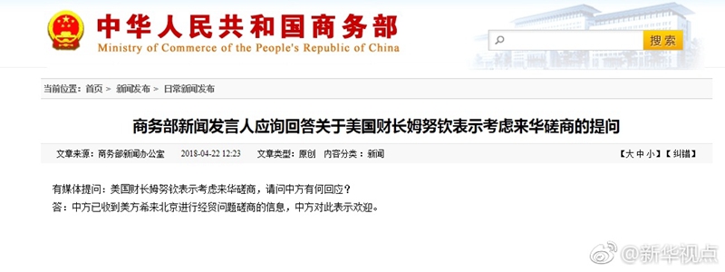 新華網(wǎng)北京4月22日電? 商務(wù)部網(wǎng)站消息,有媒體提問:美國財(cái)長姆努欽表示考慮來華磋商,請問中方有何回應(yīng)?答:中方已收到美方希來北京進(jìn)行經(jīng)貿(mào)問題磋商的信息,中方對此表示歡迎。 ????(據(jù)新華社“新華視點(diǎn)”微博報(bào)道)