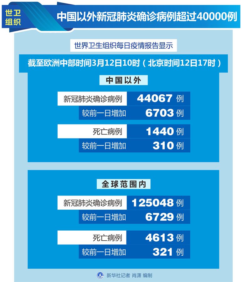 世衛(wèi)組織每日疫情報(bào)告顯示,截至歐洲中部時(shí)間12日10時(shí)(北京時(shí)間12日17時(shí)),中國(guó)以外新冠肺炎確診病例較前一日增加6703例,達(dá)到44067例;中國(guó)以外死亡病例較前一日增加310例,達(dá)到1440例。