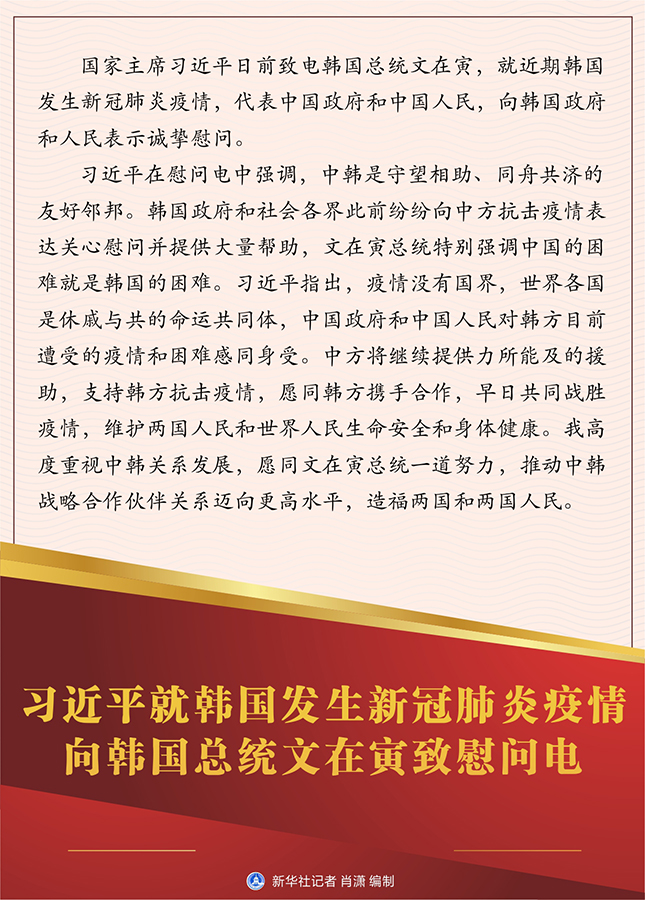 習近平在慰問電中強調(diào),中韓是守望相助、同舟共濟的友好鄰邦。韓國政府和社會各界此前紛紛向中方抗擊疫情表達關(guān)心慰問并提供大量幫助,文在寅總統(tǒng)特別強調(diào)中國的困難就是韓國的困難。習近平指出,疫情沒有國界,世界各國是休戚與共的命運共同體,中國政府和中國人民對韓方目前遭受的疫情和困難感同身受。中方將繼續(xù)提供力所能及的援助,支持韓方抗擊疫情,愿同韓方攜手合作,早日共同戰(zhàn)勝疫情,維護兩國人民和世界人民生命安全和身體健康。我高度重視中韓關(guān)系發(fā)展,愿同文在寅總統(tǒng)一道努力,推動中韓戰(zhàn)略合作伙伴關(guān)系邁向更高水平,造福兩國和兩國人民。